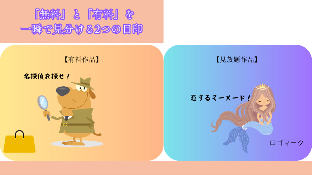 作品のポスター画像(サムネイル)の端っこにある「マーク」に注目してください。ここを見るだけで、安心してお買い物を楽しむか、無料で楽しむかを選べます。