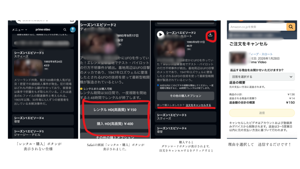 iPhoneやiPadを使っている方は、アプリの設定よりも先に知っておきたいことがあります。実は、アプリ上では「レンタル・購入」ボタンが表示されない仕様になっているのです。