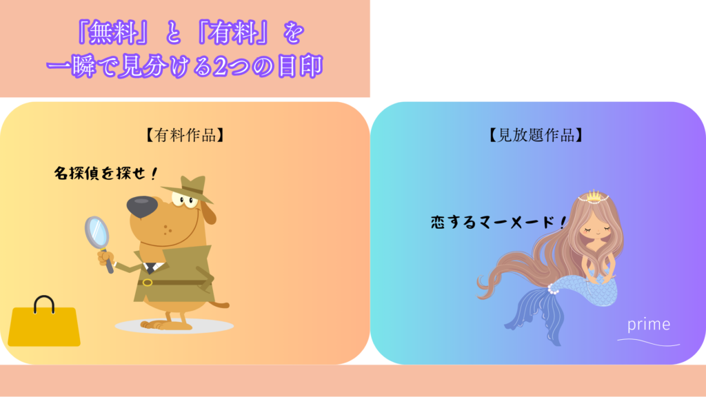 作品のポスター画像(サムネイル)の端っこにある「マーク」に注目してください。ここを見るだけで、安心してお買い物を楽しむか、無料で楽しむかを選べます。